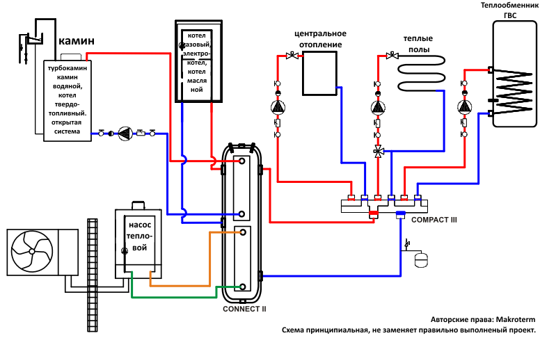 3. Сочетание в одной системе нескольких источников тепла, работающих в различных системах, работающих под давлением (открытой и закрытой) и на различных теплоносителях (вода и гликоль). Например: солнечного коллектора, котла, газового, масляного или электрического, теплового насоса, камина или котла, работающего в открытой системе центрального отопления, напольного отопления, лоток подачи горячей воды, рекуператор, обогрев подъезда или гаража.